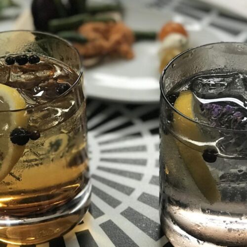 • Garnish with a lemon wheel a few juniper berries and a lavender flower