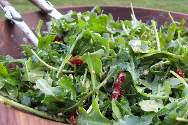 I found may favorite salad a few years ago at an Italian theme night dinner and it has become my “go to” salad – arugula, sun dried tomatoes and goat cheese with a homemade balsamic vinaigrette. Whether it’s a fancy occasion or the only course I’m making, I’ll add homemade sourdough bread croutons which makes it even better.